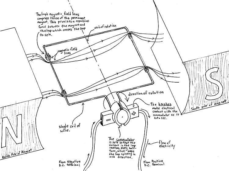 motor, here is an example (click the illustration below for a full size image). ![[a picture of a simple motor]](mattthumb.jpg) simple motor When a permanent magnet is positioned around a loop of wire that is hooked up to a D.C. power source, we have the basics of a D.C. motor. In order to make the loop of wire spin, we have to connect a battery or DC power supply between its ends, and support it so it can spin about its axis. To allow the rotor to turn without twisting the wires, the ends of the wire loop are connected to a set of contacts called the commutator, which rubs against a set of conductors called the brushes. The brushes make electrical contact with the commutator as it spins, and are connected to the positive and negative leads of the power source, allowing electricity to flow through the loop. The electricity flowing through the loop creates a magnetic field that interacts with the magnetic field of the permanent magnet to make the loop spin. For more info, please visit this site about how things work: ![[How Stuff